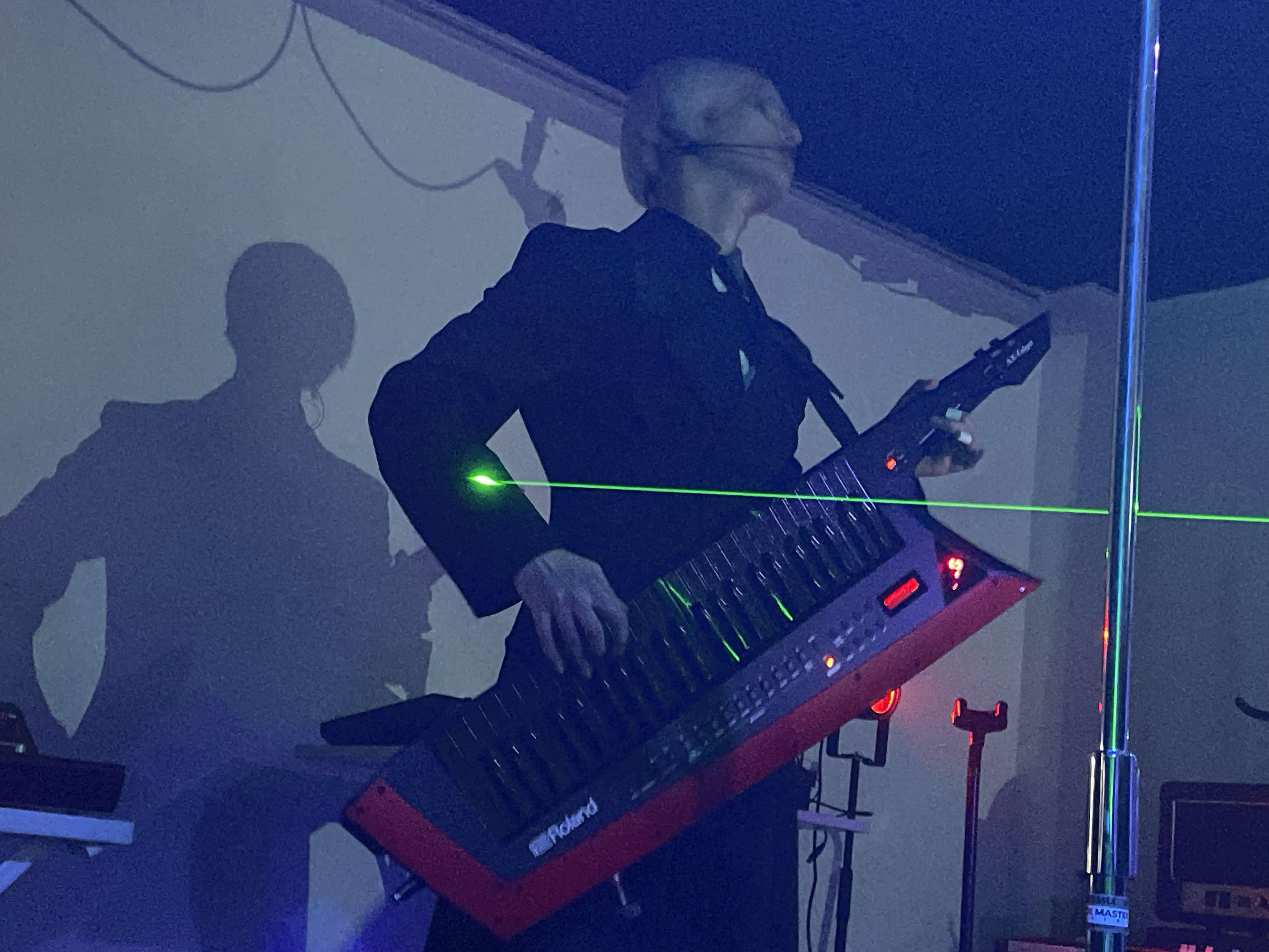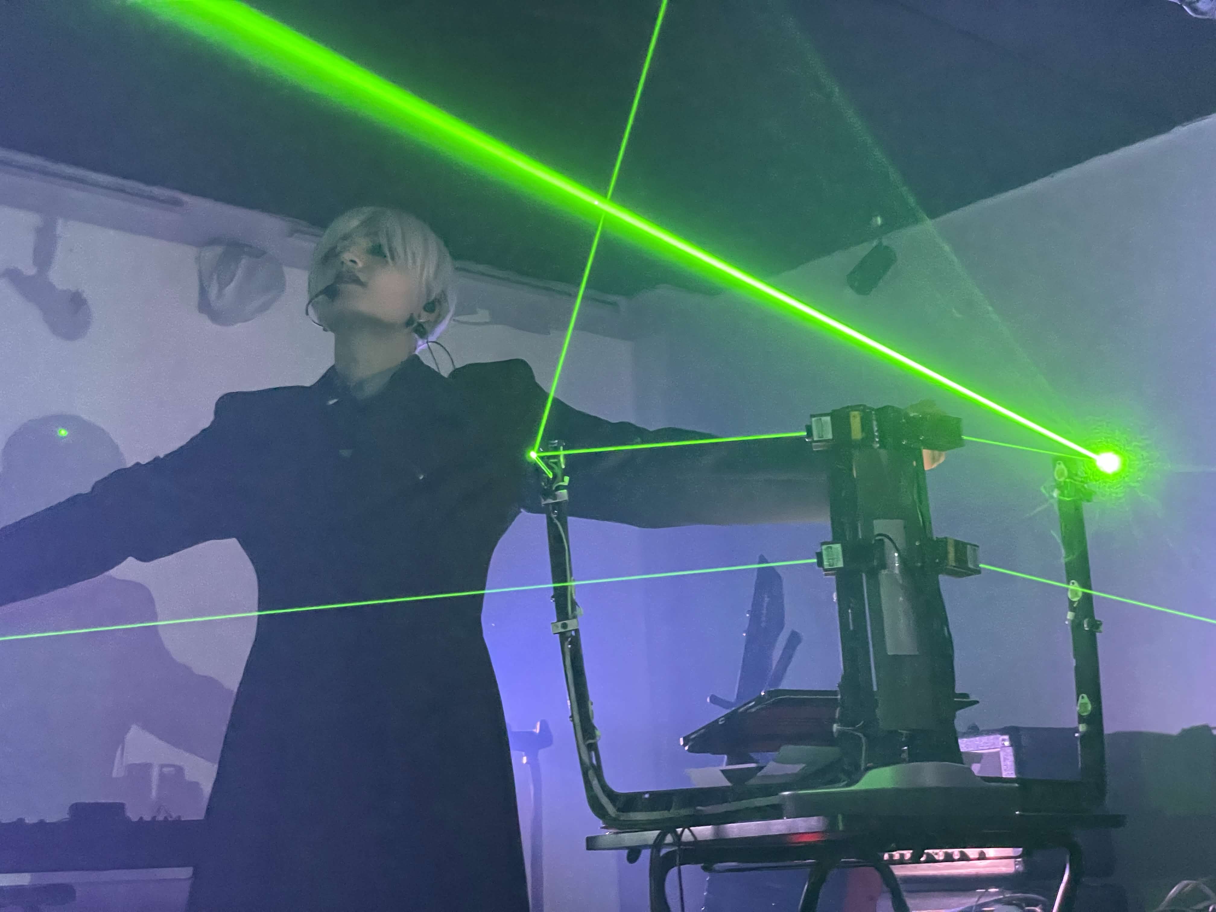 上手にレーザーハープ、やや下手側中央にスタンドマイクを配置。